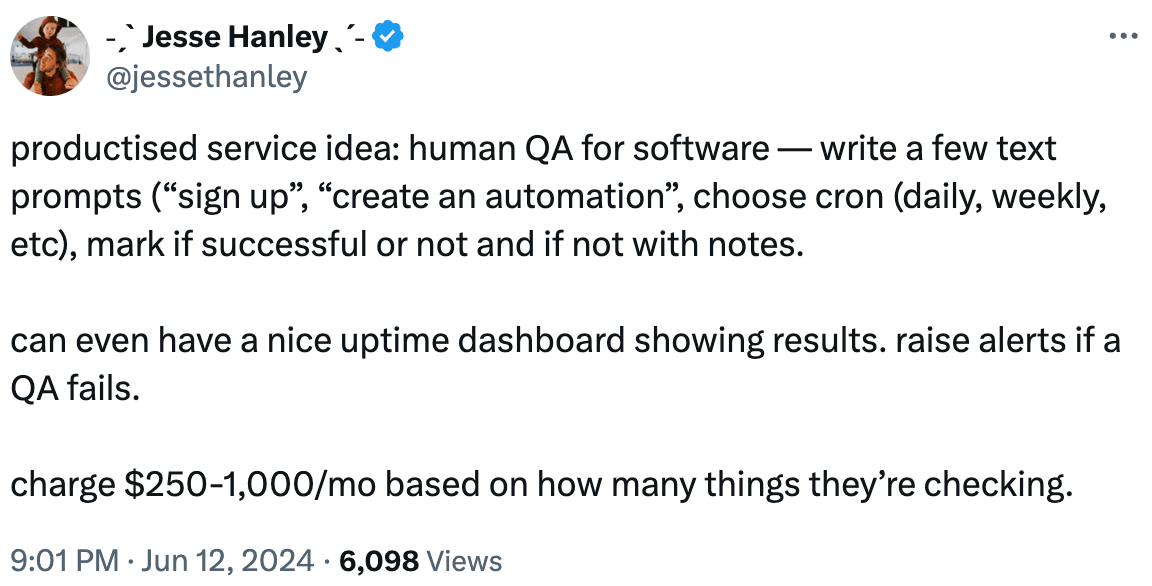 Some other niches, like engineering, are more challenging to productize (what happens when there are bugs?) but one I could see working is QA: